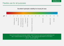 - Excellent hydrolytic stability, thus suitable for stable emulsions even under extreme pH conditions, such as self tanning products and depilatory creams