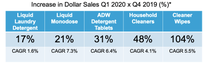 Before COVID-19, a family might have let a container of wipes languish in a cupboard for months. Now they’re wiping everything down multiple times per day, and monitoring online availability so they can purchase more as soon as shelves restock. The hockey stick growth seen in the wipes category in Q1 may not be sustainable, but it’s likely not going to experience a compensatory drop. The liquid laundry detergent category is perhaps one of the more surprising growth categories. With many workers swapping professional clothing for sweatpants (and hoping for audio-only conference calls), a drop in the category during the COVID-19 quarantine would have been reasonable. And yet, the overall trend toward cleaning more often and more thoroughly has more than offset the sudden loyalty to sweatpants. We’re filling the detergent load line to the max even if it’s a partial load, or using two pods instead of one. If we’ve been away from home, we’re dropping our exposed clothes directly into a tub of detergent and water when we return. Again, certain elements of this trend are likely to continue as we elevate our standards of cleaning for the foreseeable future.