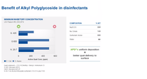 Typical alcohol ethoxylate surfactants have been shown to reduce the effectiveness of quats, meaning more of the surfactant must be present to kill the bacteria. However, similar behavior is not necessarily seen with Glucopon®, a line of alkyl polyglycoside surfactants. We believe that it is due to the ability of these APGs to provide a uniform deposition of quats on surfaces, that the amount of surfactant needed for high disinfection rates is reduced. The graph, “Benefit of Alkyl Polyglycoside,” shows that both Glucopon 425 N and Glucopon 625 UP allow you to use less active quats to kill both gram-positive and gram-negative bacteria when compared to an alcohol ethoxylate surfactant. This is due to the active ingredients being more uniformly deposited.