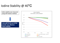 In order to be considered stable, a formula must maintain iodine levels over time. Lutensol XP90 maintained close to 0.5% iodine after eight weeks, whereas the iodine solution with NP-9 lost most of the iodine by eight weeks. BASF’s Glucopon 600 UP was tested as a 100% bio-based option for complexing iodine. The formula with Glucopon was more stable than NP-9 but lost more iodine than Lutensol XP90.